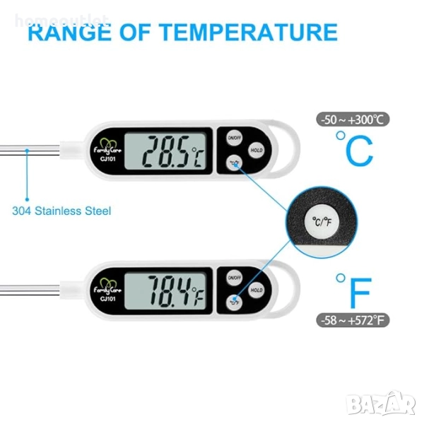 Натиснете "ON", забодете го в месото, изчакайте 5-10 секунди и натиснете бутоните HOLD. Получавате точна температура до 0,1 C/F.