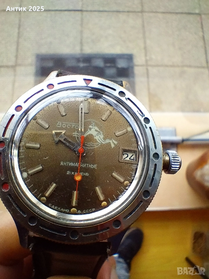 Восток, произведен в Чистополския часови завод. Механизъм: Восток 2414А, 21 камък Тип: ръчно навиване Надписи: „АНТИМАГНИТНЫЕ“, „СДЕЛАНО В СССР“ Има дата (прозорец при 3 часа) Корпус: метален, с въртящ се безел Година на производство: края на 80-те – началото на 90-те години 🧭 Класически съветски часовник, здрав и колекционерска рядкост.
