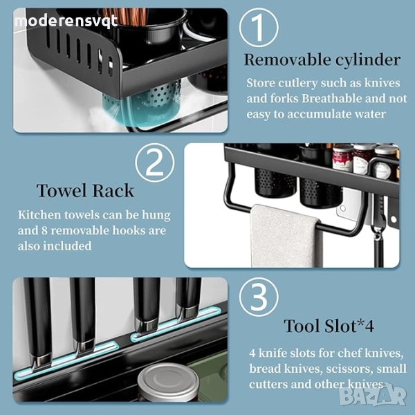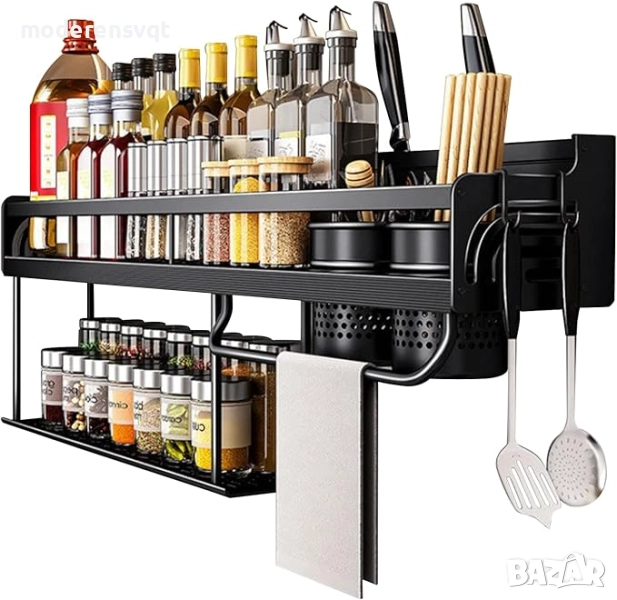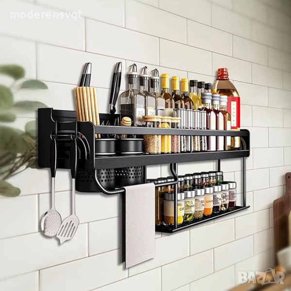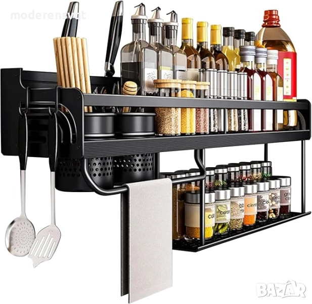 Този стенен кухненски рафт за съхранение е много рентабилен продукт за съхранение, който перфектно интегрира държач за подправки, държач за ножове, държач за клечки за хранене и държач за парцали, за да се сбогува с разхвърляната кухня.
