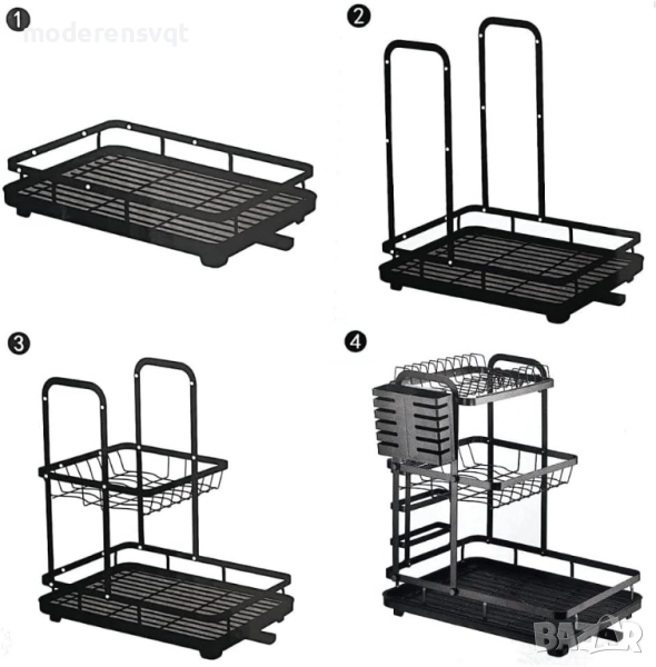 Поставка за сушене на съдове, комплект от подвижна многослойна поставка за съдове и дъска за отцеждане, органайзер с държач за прибори (3 нива)