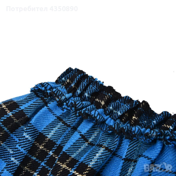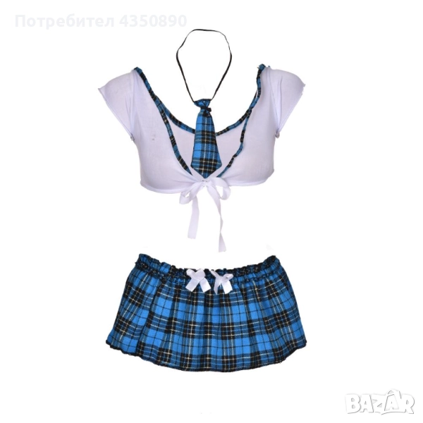 Секси и игрив костюм на палава ученичка, включващ карирана мини пола, горна част, прашки и вратовръзка. Горнището се връзва пред гърдите. Готин и свеж стил на училищна униформа, изработен от памучен смесен полиестер с изящни връзки. Меко изрязано горнище, удобно за носене. Еротичната мини пола и синята вратовръзка са в син цвят с карирана щампа. Полата има деликатно предизвикателни панделки в лявата и дясната страна.