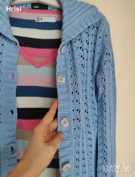 Цветен лот от блуза и жилетка - Нежна ажурна жилетка H&M - Stay в приятен син нюанс, 36 - 38 размер по етикет. В отлично състояние е. Състав: 55%акрил, 45% памук. Дължина 59см Бюст 39см Ръкав 62см - Свежа блузка KENVELO, райе с дълъг ръкав, S размер, без забележки Цена на лота 10лв/ 5,11€ *За София е възможно лично предаване