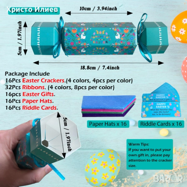 Напълнете всяка крекера с включените играчки, шапки и шеги или добавете свои собствени лични щрихи. Чудесно допълнение към всяко великденско парти, тези крекери са предназначени за забавни празненства!