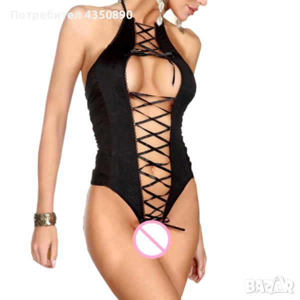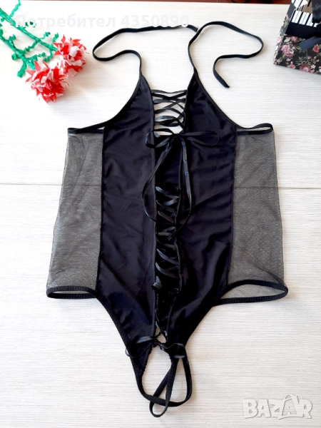 Секси боди, което пристяга вашето тяло с помощта на сатенени черни връзки. Подчертава женствено извивките на тялото и акцентрира внимание. Еротично бельо - нежно тюлено боди, което има закачливи връзки в долната и горната си част. Деликатна еластична материя.
