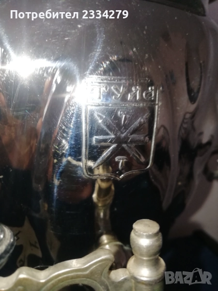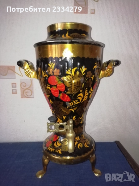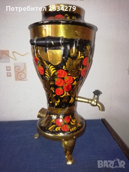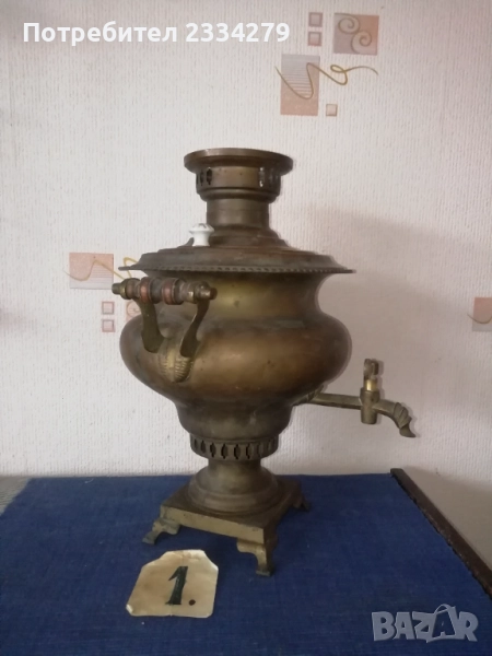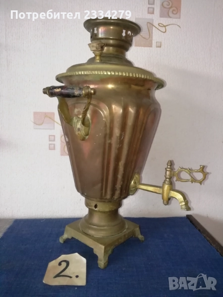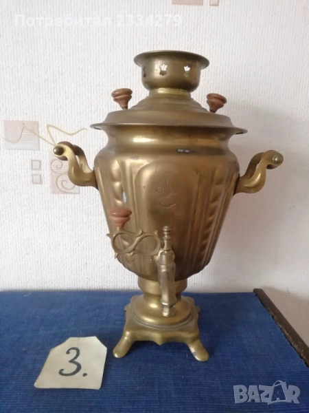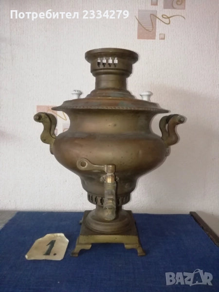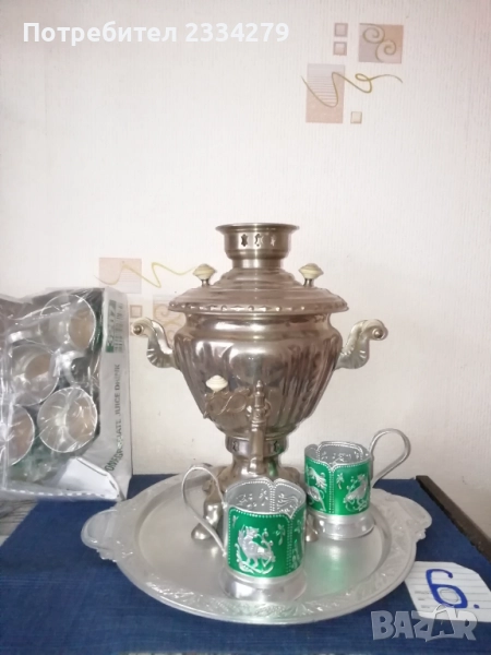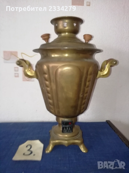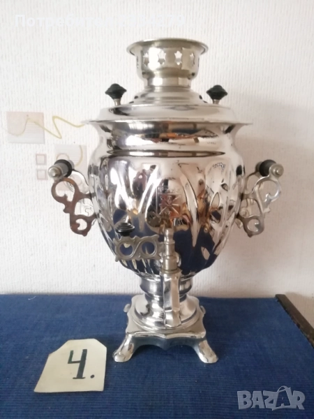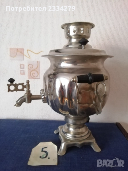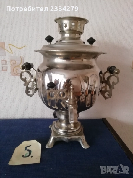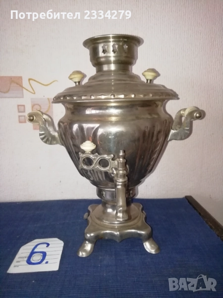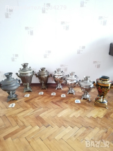 самовари изработени в различни години и републики. N:1 стар руски царски бронзов самовар на жар-въглища, отдолу има капак за поставяне на жарта, по средата има царски щемпли, знаци, 100% автентичност с размери: височина 40см., широчина 30см., цена 80€; N:2 стар масивен бронзов самовар на жар-въглища, размери 47х28см., цена 45€.; N:3 самовар на ток, бронзов има накован щемпъл отпред, комплектен с шнур-кабел, работещ, размери: височина 35см., широчина 25см., цена 40€; N:4 масивен самовар с надпис ,,Тулла" сделано в СССР, 1970-80та година, работещ комплектен с кабел, размери 36х27см., цена 25€; N:5 самовар сделано в USSR 1981година,работещ на ток има шнур, размери 35х25см., цена 25€.; N:6 самовар от 1967година сделано в СССР, размери 32х27см., комплектна цена за самовар и шест броя неизползвани стакани и табла е 28лв.
