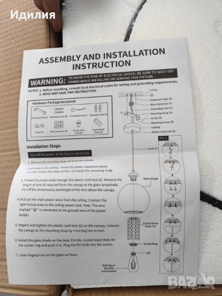Максимална мощност: 1 × 60W (крушката не е включена);