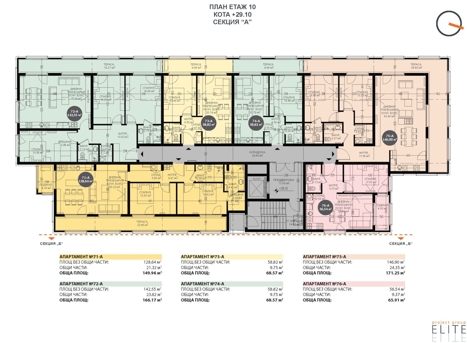 Тристаен апартамент 72-А, разположен на 10-ти жилищен етаж, вход А. Изложение: юг и запад. Разпределение: антре, дневна с кухненски бокс и трапезария, коридор, три спални, две бани, мокро помещение и тераса с панорамни гледки към Витоша и София. Чиста площ 142,55 м² + 23,62 м² общи части (14.2%). Възможност за закупуване на до два гаража (с възможност за паркиране на до четири автомобила) в ниво сутерен с цени от 35000 евро без ДДС.
