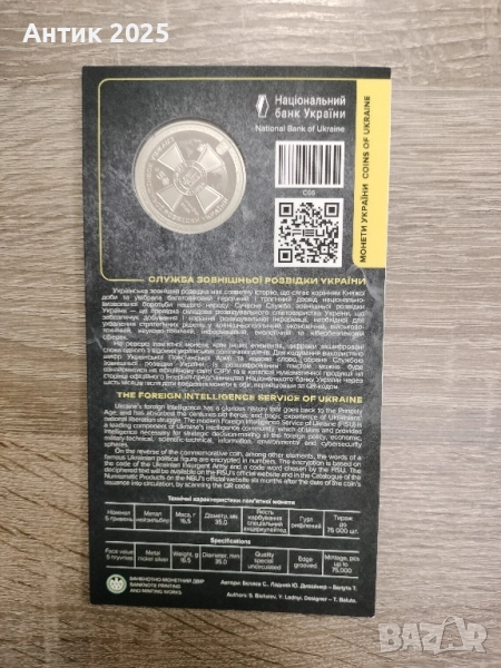 Колекционерска възпоменателна монета, посветена на Службата за външно разузнаване на Украйна (СВРУ) – специална държавна институция, която защитава националните интереси на Украйна в областта на външната политика, сигурността и отбраната.