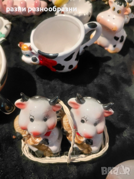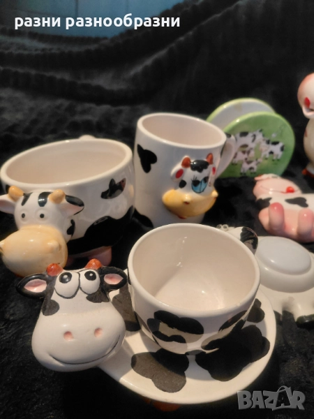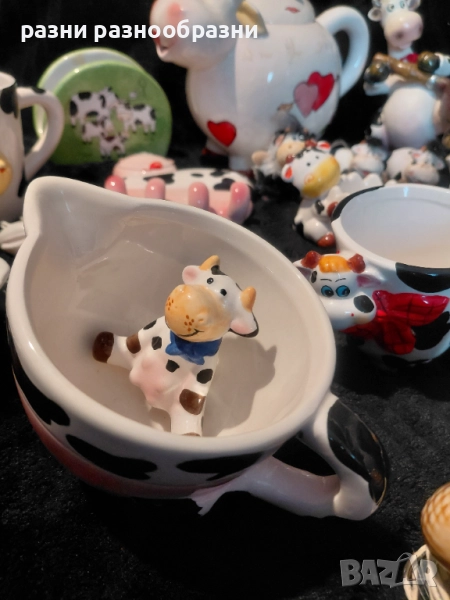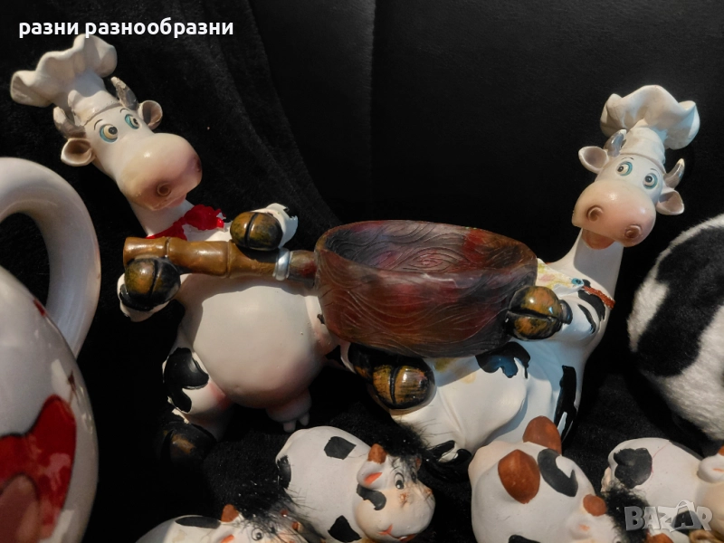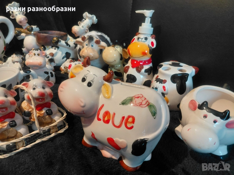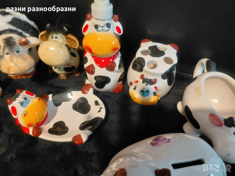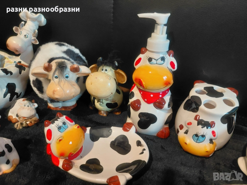 Интересна мини колекция от фигурки на крави. Различни по размер и материал_керамика, полипропилен. Фигурки за украса, касички, чаши, чайник, сет за баня, поставка за бутилка....