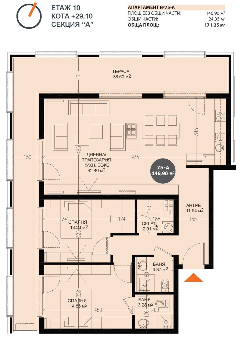Тристаен апартамент 75-А, разположен на 10-ти жилищен етаж, вход А. Изложение: запад и север. Разпределение: антре, дневна с кухненски бокс и трапезария, две спални, две бани, мокро помещение и периферна тераса с панорамни гледки към Витоша и София. Чиста площ 146,90 м² + 24,35 м² общи части (14.2%). Възможност за закупуване на до два гаража (с възможност за паркиране на до четири автомобила) в ниво сутерен с цени от 35000 евро без ДДС.