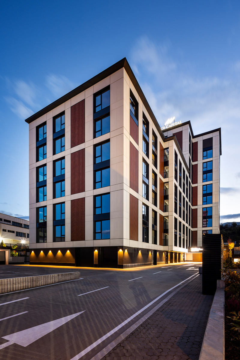Общи части: Луксозно изпълнение с настилки от естествен камък кварцит и HPL ламперии в зоната на лобитата; испански гранит и винилови тапети Vescom в коридори. Богато озеленяване с капково напояване и градинско осветление.