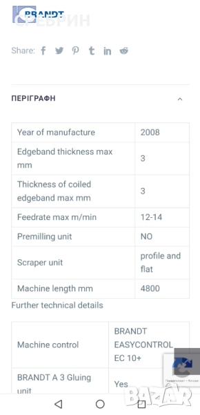 Само по заявка кантираща машина 2008г. Модел BRAND OPTIMAT KDF 430 C. С предфрезоване и постформинг, с височина до 60мм. и скорост 14м. в минута. Машината е на 100% ревизирана в Гърция, Атина и в момента работи и може да се види на място в Гърция, Атина. Цената е крайна. Към нея е включен транспорт от Атина до Казанлък. Разполагам с още 10 броя кантиращи машини с предфрезоване и постформинг + други над 350 машини в двата ни склада - България гр. Казанлък и Гърция, Атина.