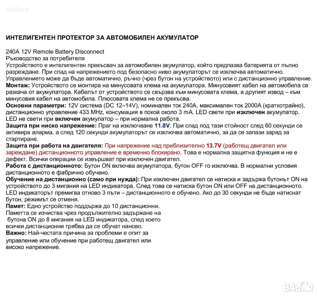 С дистанционно, предназначен за защита и предпазване на акумуалтори и запазване на електрическата енергия в тях.