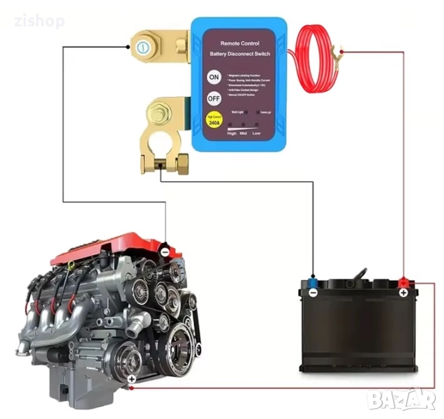 Прекъсвачът се свързва, като основен ключ между двигателя и акумулатора и се активира при спад на напрежението под 11.8V