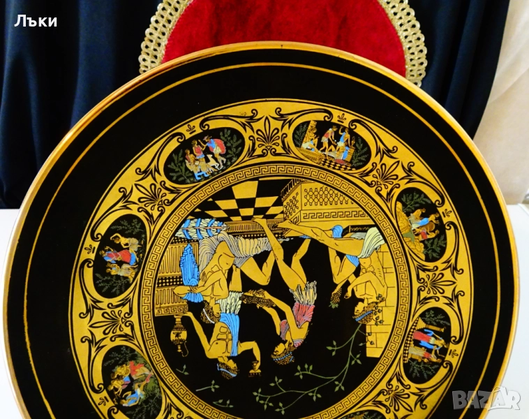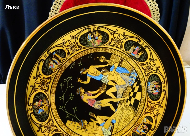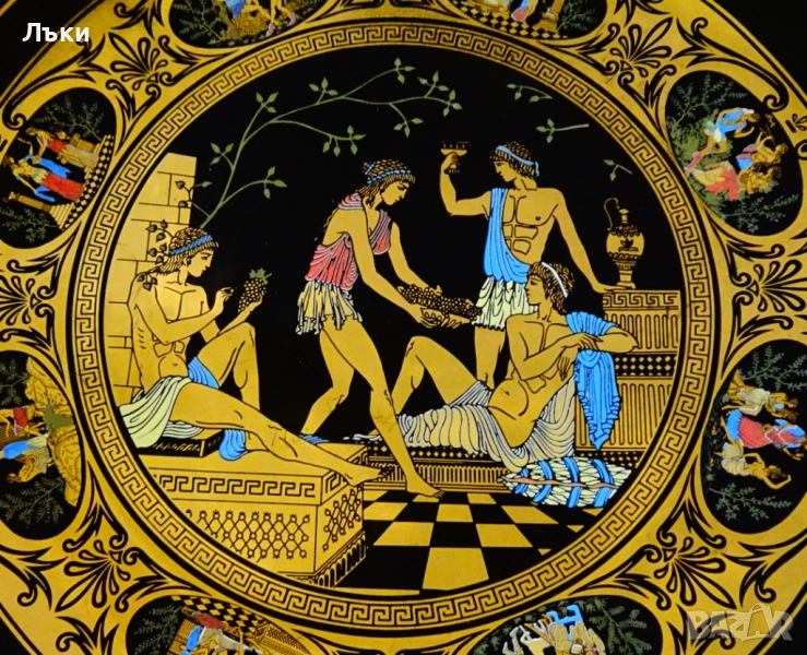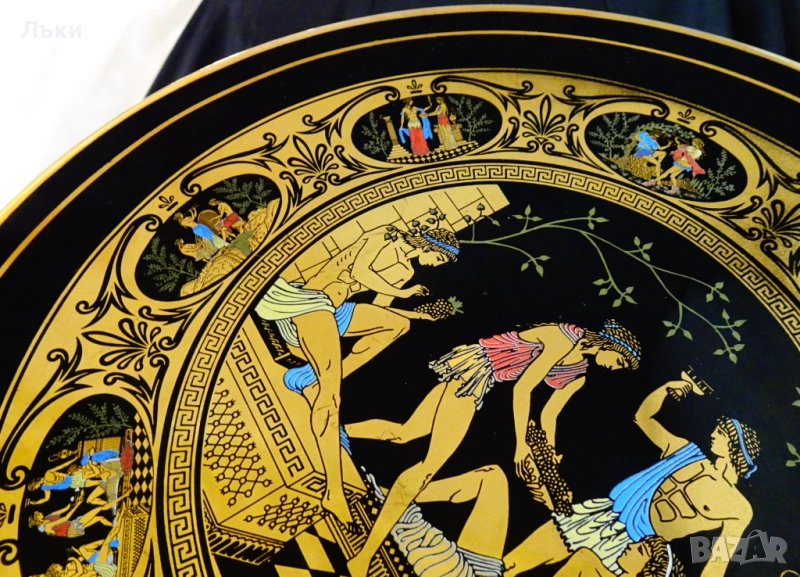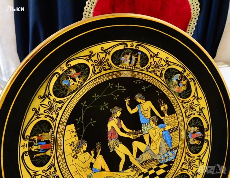 Древногръцки богове и богини,които пируват с грозде и вино.Чинията е маркирана Adis Hand Made in Greece 24 k Gold.Има