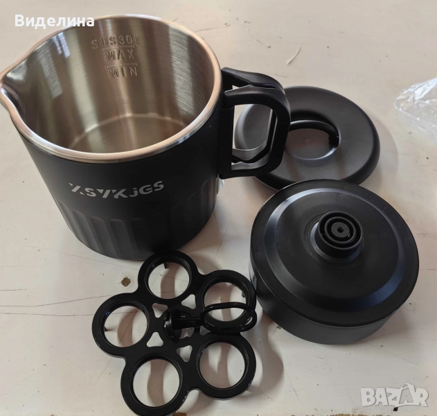 Комплектът включва: чайник, капак, захранваща база, стойка за яйца.