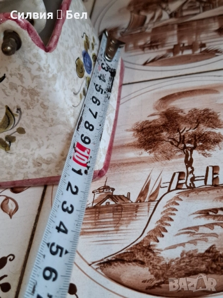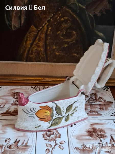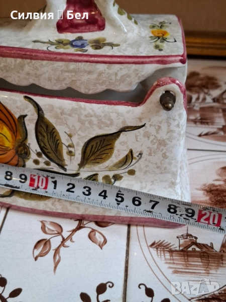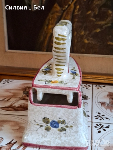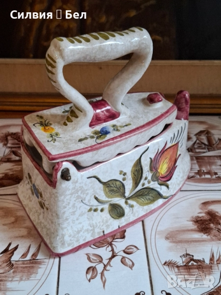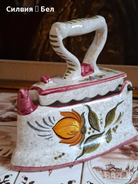 Керамична Кутия/Декоративна Ютия с Флорални Мотиви – Произведено в Италия Кутия, оформена като старинна ютия. Този чаровен предмет е не само декоративен акцент, но може да служи и като оригинална кутия за бижута, бонбониера или просто като колекционерска декорация. С форма на класическа ютия с дръжка, като капакът се отваря, разкривайки вътрешността (вижте втората снимка). Ръчно изрисувани флорални мотиви в топли цветове – оранжево, зелено и синьо-лилаво, върху бял (кремав) фон. Контурите и ръбовете са подчертани с цвят пепел от рози/бордо. "MADE IN ITALY" и цифра "8974" Състояние: Отлично запазено, без видими пукнатини или отчупвания. Това е чудесно допълнение към всеки интериор, носещ италиански чар и винтидж дух, както и перфектен подарък за ценител на ръчно изработената керамика. Размерите ги има в снимки. Не пропускайте възможността да притежавате този артистичен и функционален предмет! Цена 5️⃣0️⃣лв.25,56 € ೋ🌷 ೋ🌷 ೋ🌷
