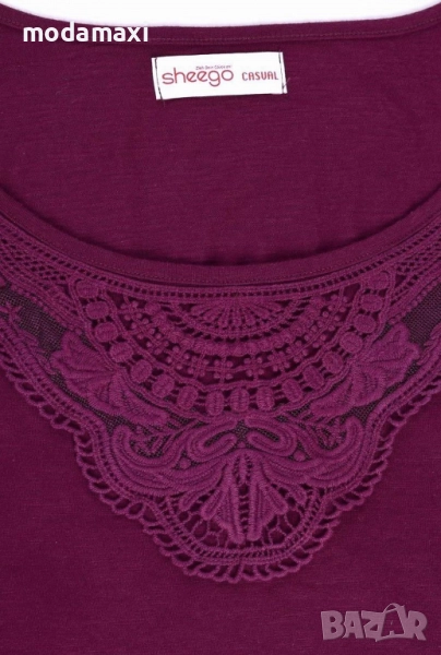 Блузата е в много красив винен цвят, с плетена памучна дантела под деколтето