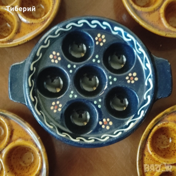 Винтидж 5 броя керамични чинии за печене и сервиране на ордьовъри/охюви с богата глазура и дръжки, маркирани, като нови, неупотребявани. Размери-дъжина с дръжката-19 см.
