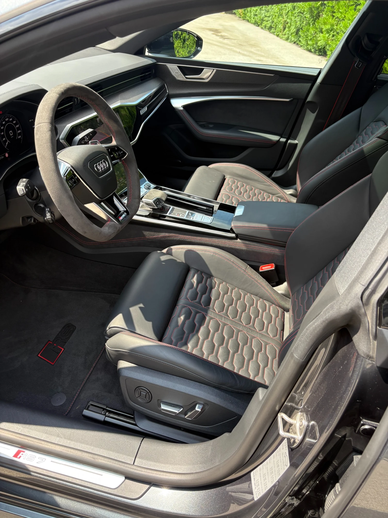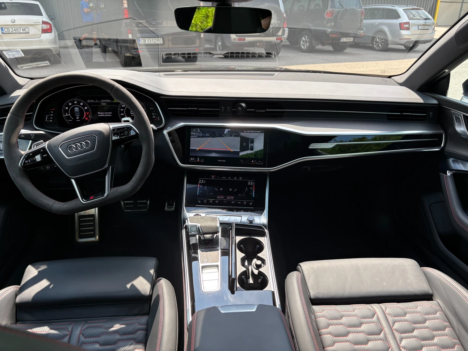 Допълнителни екстри Виртуален кокпит Audi plus с допълнителен дигитален инструментален панел с RS оформление Електрически външни огледала. Регулируемо, отопляемо и сгъваемо външно огледало с автоматично затъмняване и памет. Дясно външно огледало с функция за автоматично осветяване на бордюра. Премиум озвучителна система AUDI . HD Matrix LED фарове с лазерни светлини Audi. LED задни светлини, система за почистване на фаровете (SRA). Металик боя. Черен стилистичен пакет plus. Пръстени и лога на Audi в лъскаво черно. Панорамно стъкло. Електрически панорамно отваряемо стъкло. Тонирани стъкла. Тонирани задни стъкла. RS спортна изпускателна система. RS стоманена спирачна система с червени спирачни апарати. Камера за задно виждане. Сгъваема задна седалка. Задни седалки. 2+1 места. Тапицерия на седалките: Перфорирана кожа Valcona с капитониране тип пчелна пита . Спортни седалки plus с вентилация на предните седалки. 22-инчови алуминиеви джанти, черни. Стандартно оборудване. Пакет за съхранение. Въздушна възглавница от страната на пътника, деактивирана. Въздушна възглавница от страната на водача/пътника. Прозорци на вратите с акустично стъкло. Странични. Пакет Ambient Lighting Plus Антиблокираща спирачна система (ABS) Тип задвижване: Задвижване на всички колела Audi Drive Select Интерфейс за смартфон Audi Интернет-базирани услуги Audi Connect Система за спешни повиквания и асистенция Audi Connect Музикален интерфейс Audi Асферично външно огледало, ляво Асферично външно огледало, дясно Черно външно огледало LED мигачи, интегрирани във външните огледала Черен текстилен таван Алармена система против кражба с вътрешна сигурност и защита от теглене Двойни сенници (плъзгащи се, разтегателни) Осветени прагове на вратите с алуминиева инкрустация и надпис LED светлини за влизане с функция за прожектиране Електронна програма за стабилност (ESP) Система за подпомагане на шофирането: Асистент за спиране (Audi pre sense) отпред) Система за асистенция при шофиране: Асистент за дълги светлини Система за асистенция при шофиране: Система за защита на пътниците (Audi pre sense basic) Система за асистенция при шофиране: Предупреждение за напускане на лентата Информационна система за водача (FIS) с цветен дисплей Електрически задни стъкла Електрически предни стъкла Топлоизолиращо предно стъкло Електрически капак на багажника Ограничител на скоростта Темпомат 8-степенна автоматична скоростна кутия - Tiptronic Електрически разтегателен заден спойлер Интериор: Декоративни инкрустации Aluminum , Carbon Race Anthracite Интериор: Елементи от синтетична кожа, отгоре и отдолу Вътрешно огледало с автоматично затъмняване Isofix крепежни елементи за детски столчета на предната пътническа седалка и отзад Каросерия: 4-врата 4-зонов комфортен автоматичен климатик Система за въздушни възглавници за глава (Sideguard) Резервоар за гориво: 73 литра LED задни светлини с динамични мигачи LED дневни светлини Електрически регулируеми предни лумбални опори Отопляем 3-лъчев спортен кожен волан (сплескан в долната част) с Multifunction Plus и функция за превключване на предавките , alkantara . Регулируема кормилна колона Mild Hybrid 441 kW (4, 0-литров двигател - 441 kW V8 32V TFSI) Предна централна подлакътничка Мултимедиен интерфейс MMI Basic Plus / MMI Radio Plus Мултимедиен интерфейс MMI Navigation Plus с MMI Touch Пакет за непушачи Черен стилен пакет, гланцирани черни лайсни на прозорците Филтър за твърди частици за бензин Филтър за 