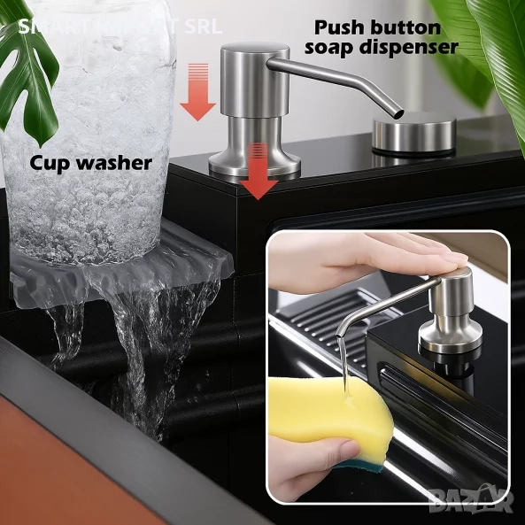 Освен това тази мултифункционална мивка има и допълнителни функции. Има вградена система за измиване на стъклата, което улеснява почистването и изсушаването им ефективно. Предлага се и с вграден дозатор за сапун, така че винаги ще имате лесен достъп до сапуна, от който се нуждаете, за да измиете ръцете си или чиниите в кухнята. Освен това мивката включва и кран за пречистване на водата, който ви позволява да получавате пречистена вода директно от мивката, без да е необходим отделен филтър.
