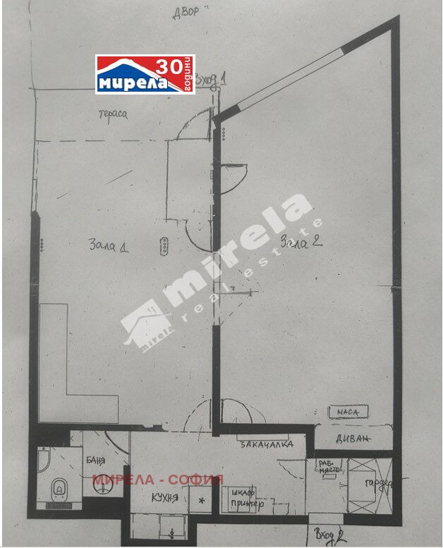443943 Отдавам под наем напълно обзаведен и технически оборудван офис със статут на езиков център. Застроената му площ е 95 кв. м, отделно има тераса и двор. Имота е с два входа.