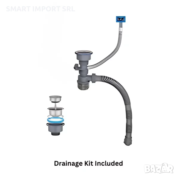 Комплектът включва следните аксесоари: кран, сифон, дъска за рязане и две PVD кошници. Двойният кран позволява индивидуален и лесен контрол на водния поток от всяка мивка. Дренажът е ергономично проектиран за ефективно оттичане на мръсна вода. Интегрираният чопър в мивката ви позволява да нарязвате храна директно в мивката, без да е необходим отделен чопър. Двете PVD кошници са полезни за събиране на отпадъци по време на готвене или миене на съдове.