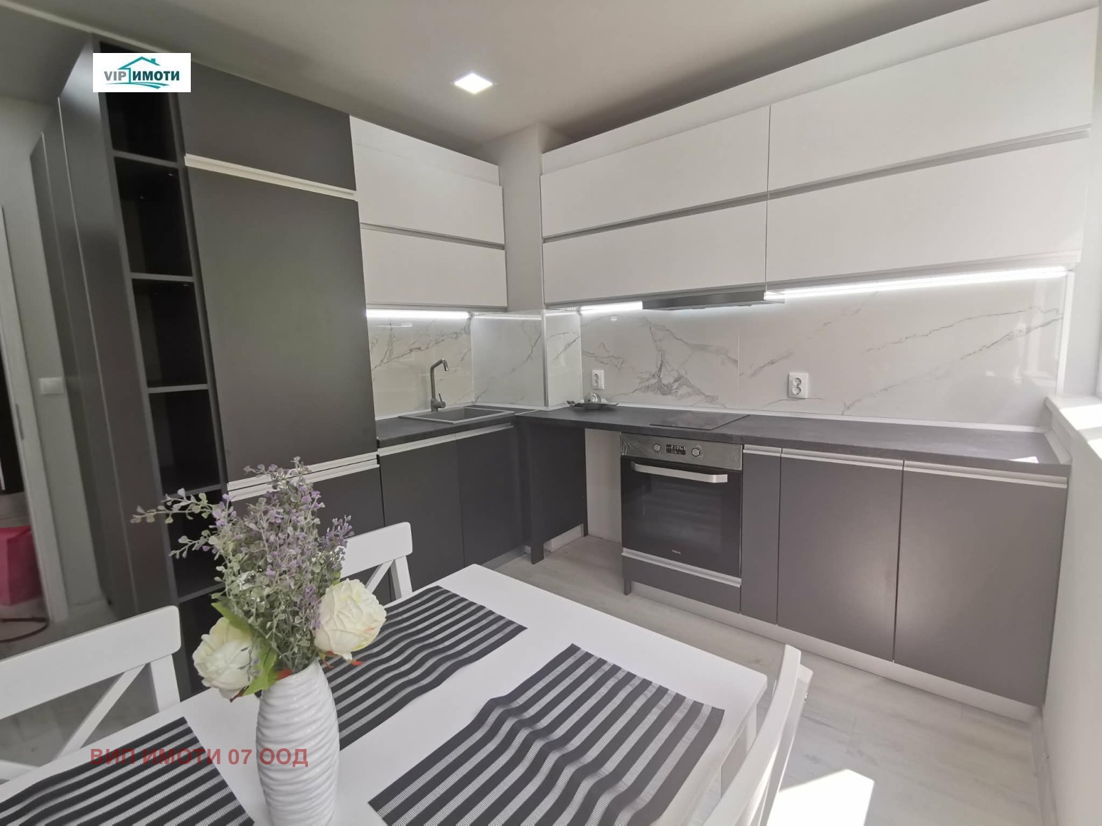 Жилището е с подменени електрическа и ВиК инсталации, нова дограма, качествени подови настилки и фини мазилки. Кухнята е функционално организирана с модерни шкафове, вградени уреди и LED осветление, като пространството е светло и добре усвоено с обособена трапезарна част до прозорците. Спалнята е просторна и завършена в неутрални тонове, създаващи усещане за уют и комфорт, с практични мебели и добро разпределение. Банята е изцяло обновена с модерна визия и качествени материали.