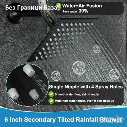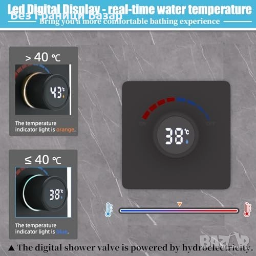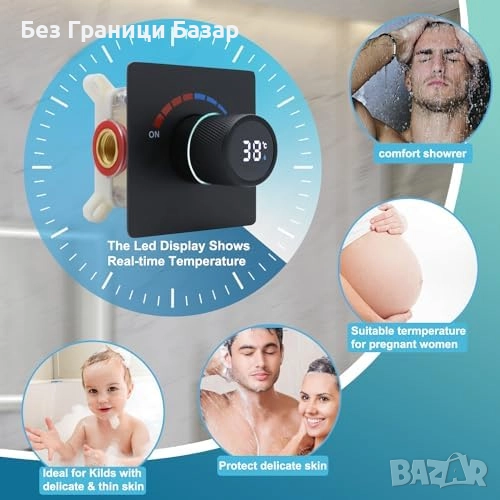 Нов Луксозен душ сет с LED термо дисплей и дъждовна глава 6", Черен за баня
