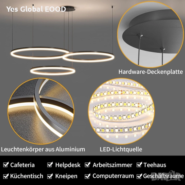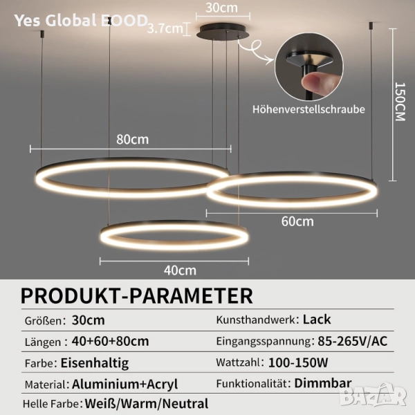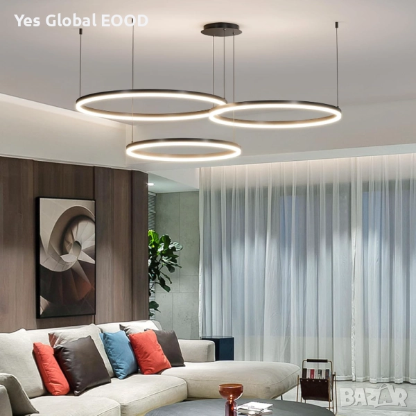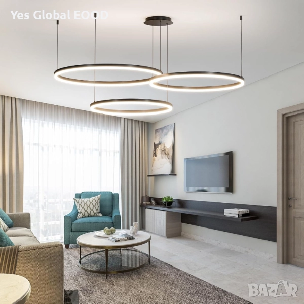 Mikeru модерният LED полилей с три кръга (40 см, 60 см и 80 см) комбинира елегантен черен дизайн и интелигентна функционалност. Благодарение на регулируемата височина и димируемата светлина (10%–100%), лампата позволява създаване на перфектна атмосфера за всяка обстановка. Предлага три цвята на осветлението — топло (3000K), неутрално (4500K) и студено (6500K), както и функция за запаметяване на последната настройка. Идеална за трапезария, кухня или модерен интериор.