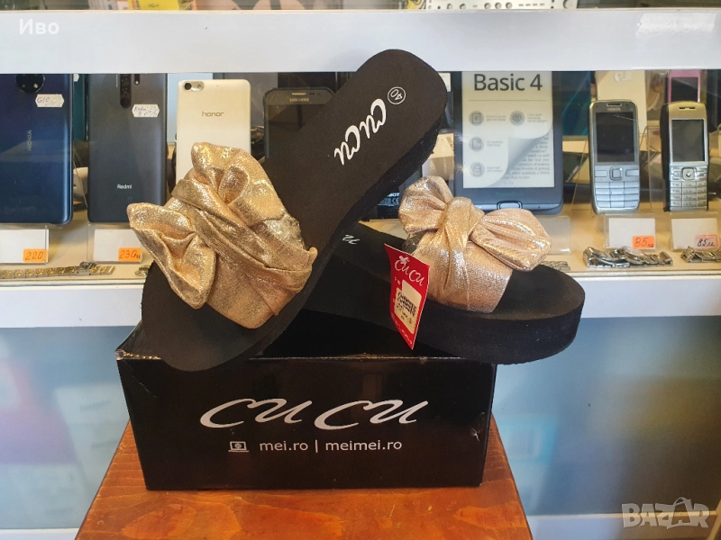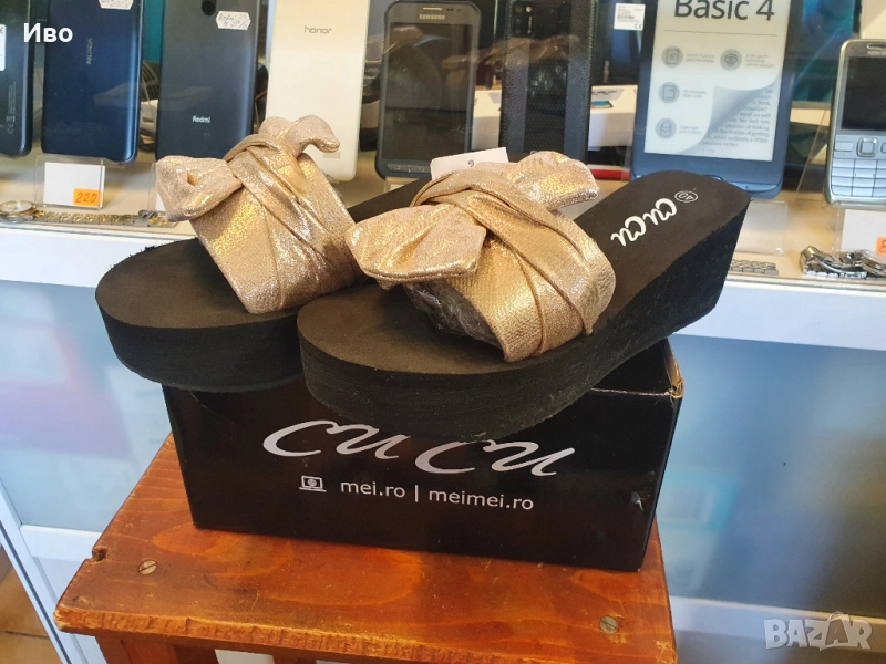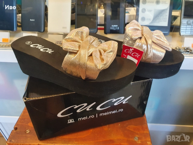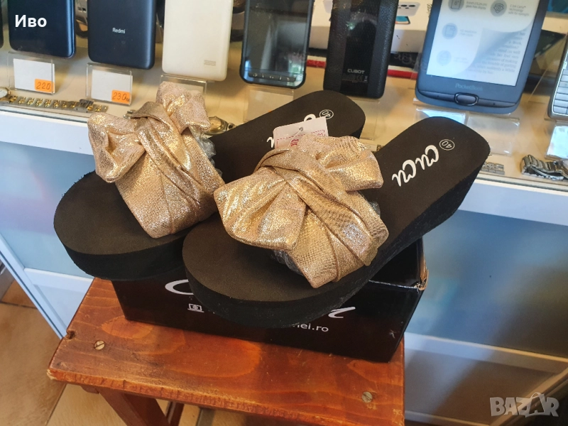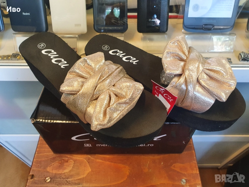 Черни дамски чехли на платформа със златист елемент Чисто нови! Височина 6,5см. Отговарят на 39 номе → Обява 51996177