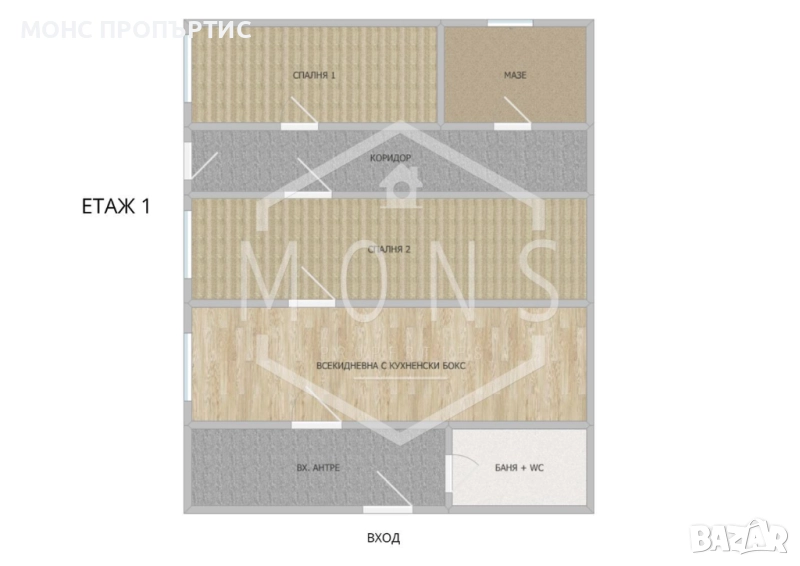 -Първи етаж - Входно антре, баня с тоалетна, кухненски бокс, две спални и мазе.