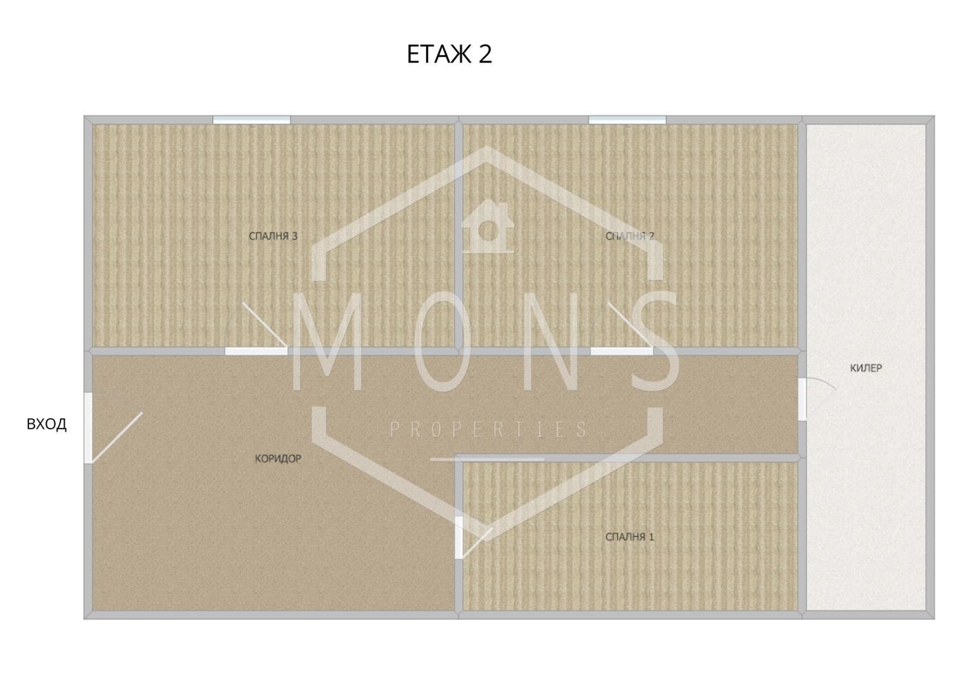 -Втори етаж Коридор, две спални, килер и голям балкон.