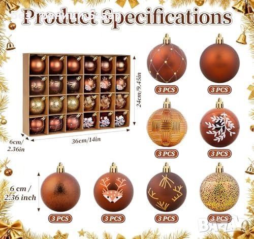 Нов Комплект 24 нечупливи коледни орнаменти злато и бронз 6 см Украса