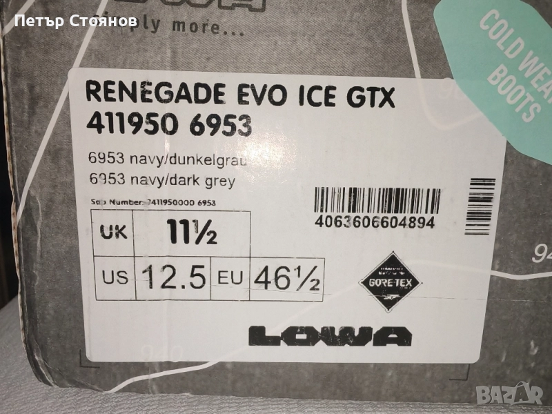Предлагам страхотни мъжки зимни боти на реномираната марка Lowa моделът е Renegade EVO ICE GTX. обувките са чисто нови, в кутия и с етикет. Купени са преди два месеца на разпродажба за 199 евро при редовна цена от 260 евро. Бяха предназначени за подарък, но в последния момент се взе решение за друг подарък и ботите останаха така. Прекрасни обувки, произведени в Словакия от черна естествена кожа и текстил. Хастарът и стелката са от топъл полиестер, имат водоустойчива дишаща Gore Tex мембрана. Подметката е VIBRAM• Vibram® Arctic Grip Trac® - подметка с големи грайфери за отлично сцепление при катерене и спускане. Изработена от гумена смес, създадена специално за зимни условия и ниски температури с отлична устойчивост на пързаляне върху ледени и снежни повърхности.