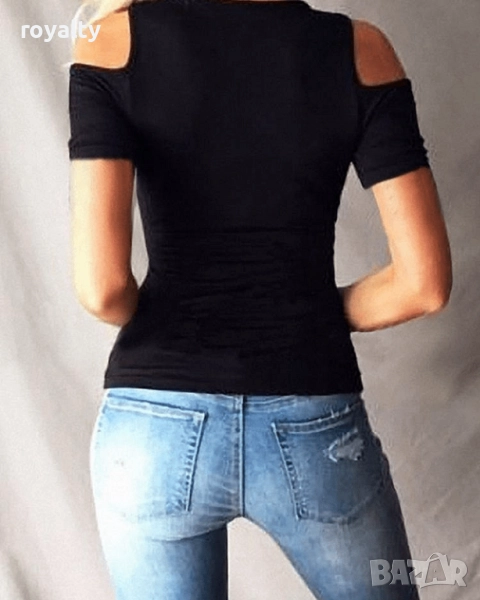 Дамска черна блуза с къс ръкав и ефектно деколте → Обява 51997122