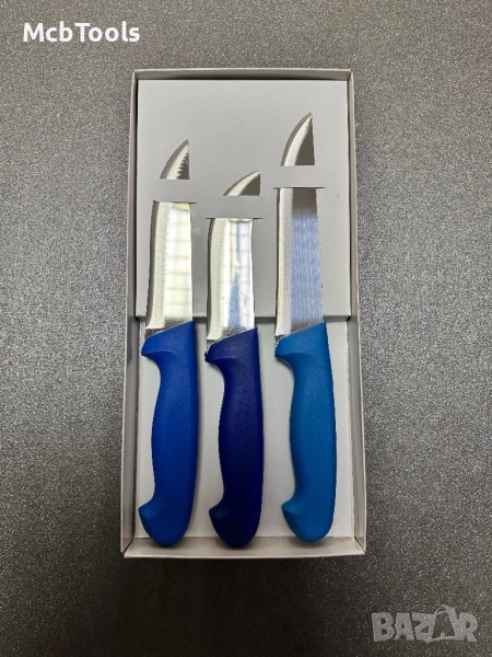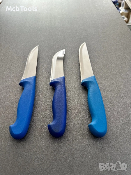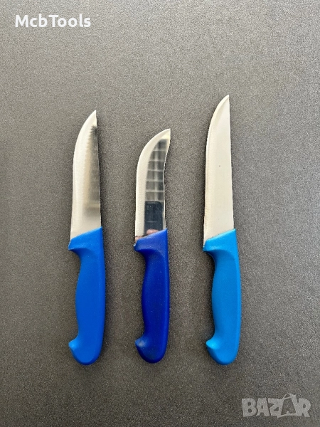 Комплект касапски ножове подходящи за транжиране, рязане на зеленчуци, месо и други. Изработени от неръждаема стомана с тройно заточено острие. Подходящи за професионална употреба. Произведени в Турция. Комплектът съдържа нож за обезкостяване, дране, колене и рязане.