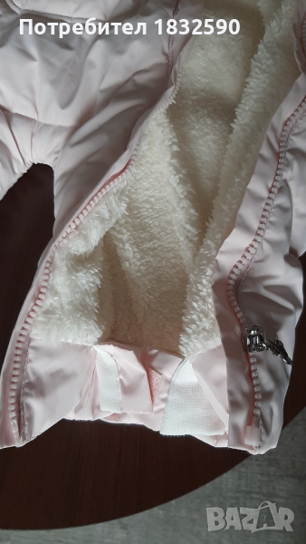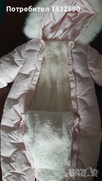 Няма следи от употреба. Много добре подплатен и топъл, на ръкавите и крачолите е с допълнителни маншети. Пухчето на качулката се сваля. Дължина 60 см.