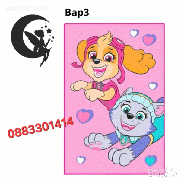 детски килим с изображения на героите от анимационния сериал Пес патрул. Подходящ за игра и украса на детска стая.