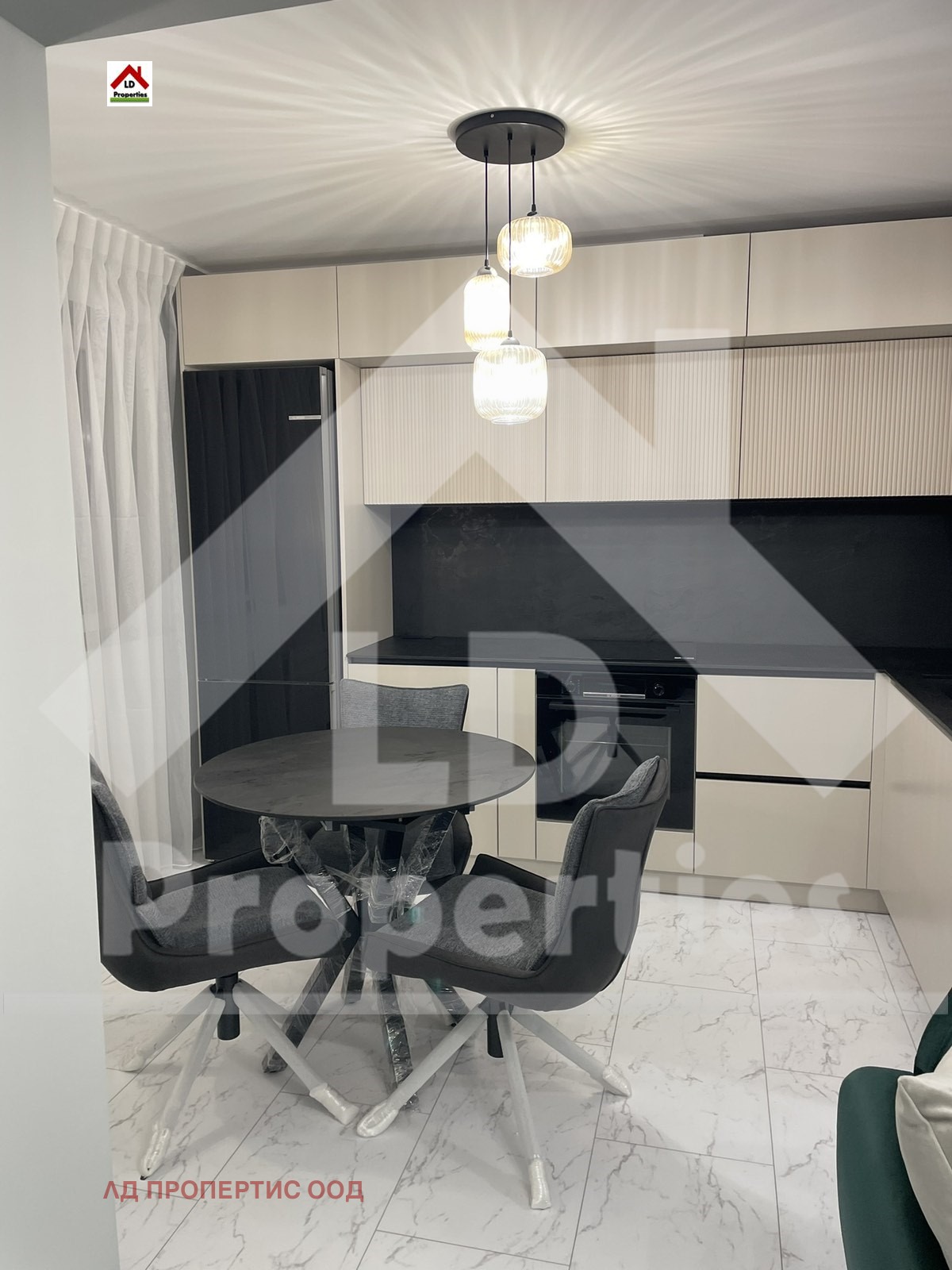 Жилището е обзаведено по дизайнерски интериорен проект с поръчкови мебели .