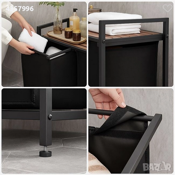 Кош за пране с черна метална рамка, черен полиестерен оксфорд плат, който е прикрепен към рамката с лента за закрепване между чатали. Кошът се изважда от рамката, за да се поставят дрехи. Отгоре има дървен рафт за организиране на перилни препарати или продукти за лична хигиена.