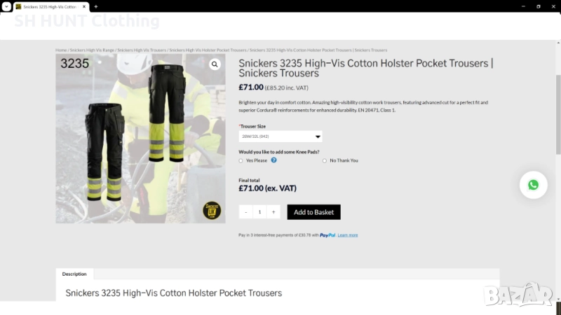 Snickers 3235 High-Vis Cotton Holster Pocket Work Trousers - работен панталон. Има джоб на коляното за наколенка, гъба. НОВ