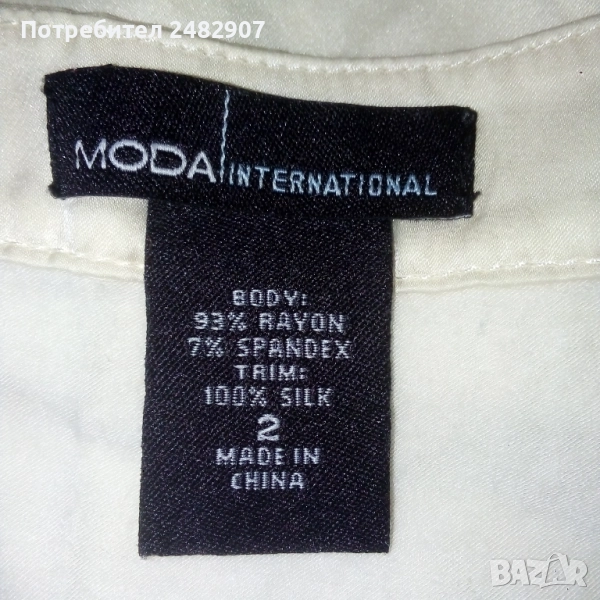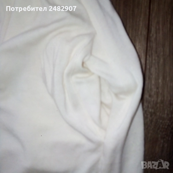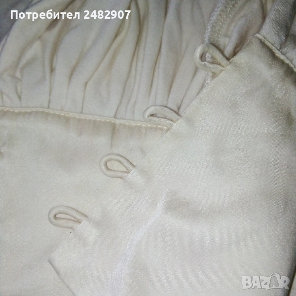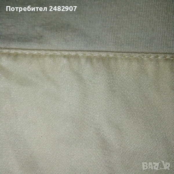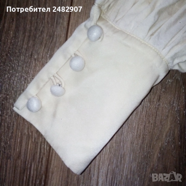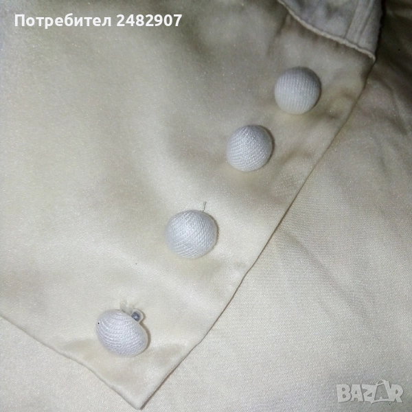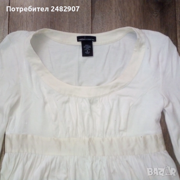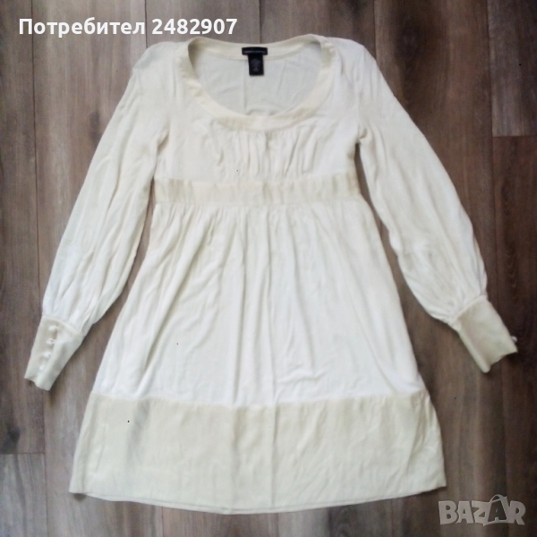 Дамска туника, цвят шампанско, размер S. Съдържа 93 % райън и 7 % спандекс. Ширина в раменете - 36 см, ширина под мишниците - 40 см, ширина в долната част - 65 см, дължина от рамото до долу - 83 см, дължина на ръкава от рамото - 60 см, ширина на ръкава в долната част - 8,5 см. Много запазена, обличана веднъж за повод, с два джоба и страничен скрит английски цип вляво. Дължина на ципа - 22 см.