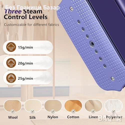 Три нива на пара (15/20/25 g/min) – безопасен за всички материи, от коприна до деним