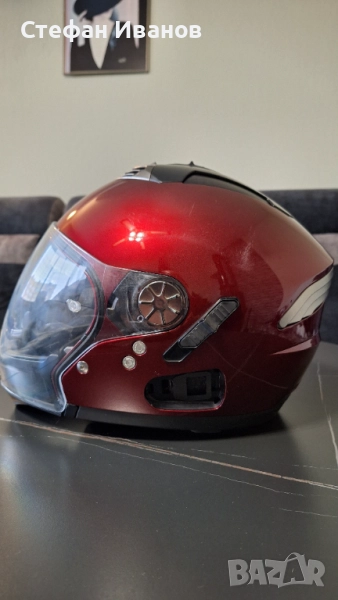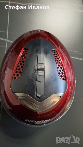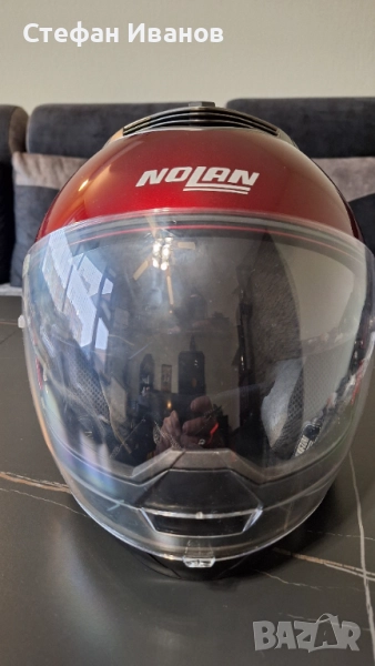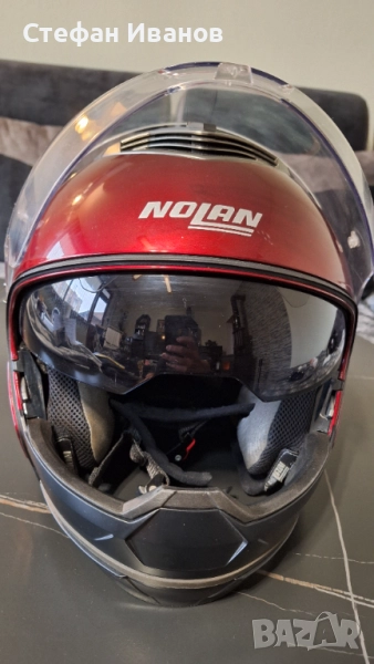 Каска Нолан, внос от Германия, липсва едно капаче от едната страна на каската(видно от снимките), но не е проблем да се ползва и така.Слюдата ,както и тъмната нямат надраскано!