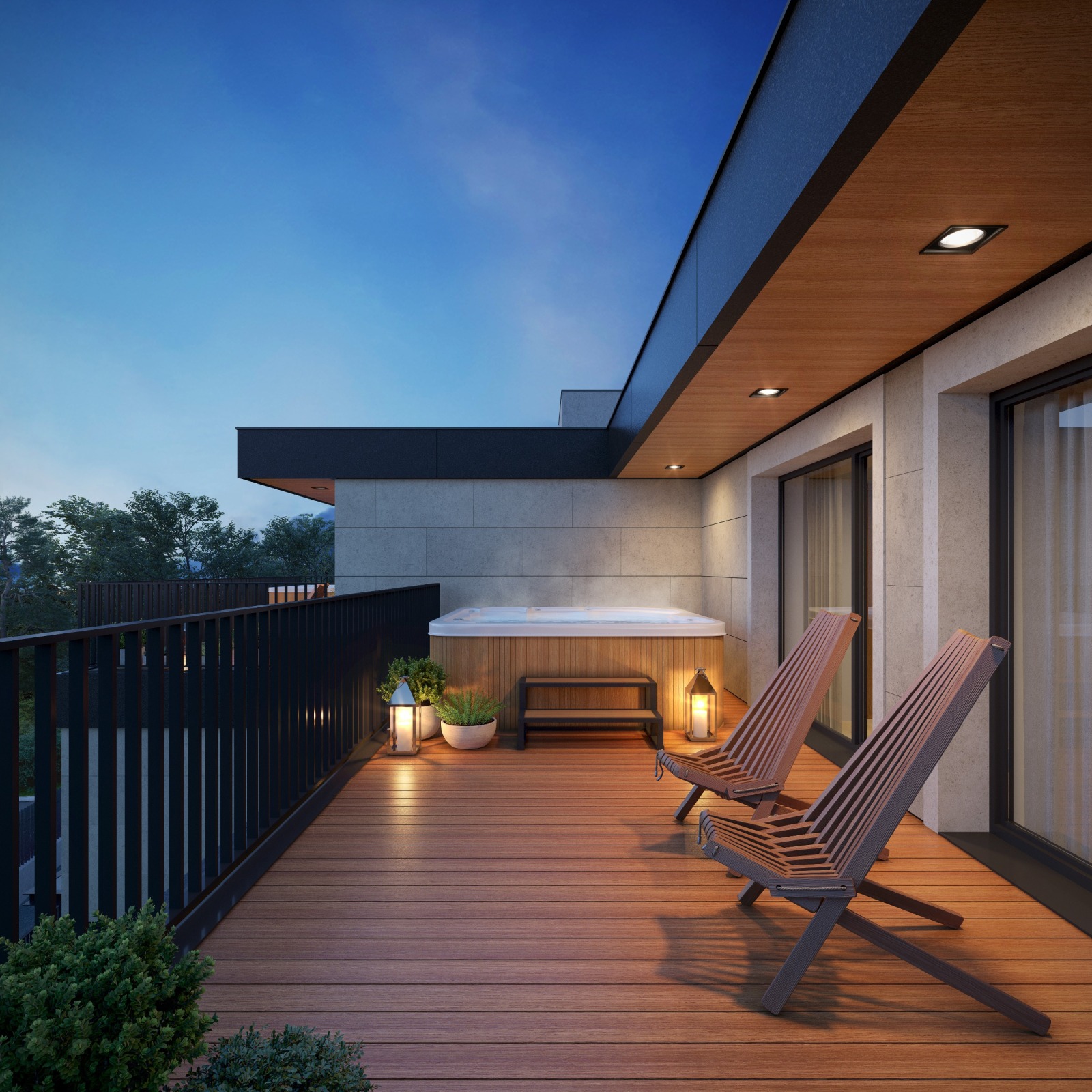 На последното ниво място за релакс, голяма панорамна тераса и външно джакузи с гледка към града. Там, където денят приключва красиво.