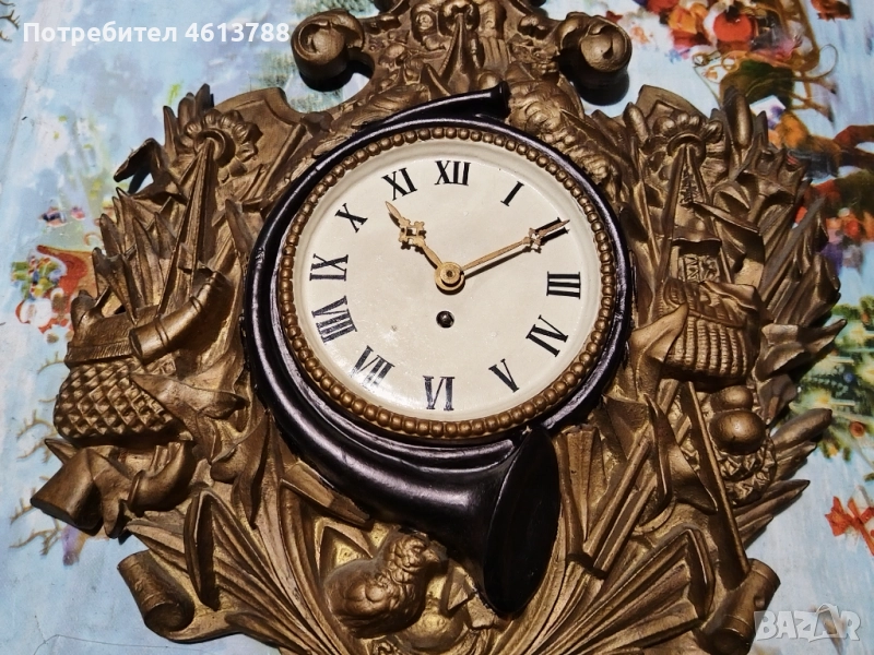 Часовника е масивен и тежък.Чугун с ловни мотиви.Не работи за ремонт.Подходящ за колекция или ловна станция.Лично предаване.