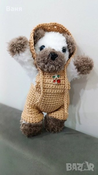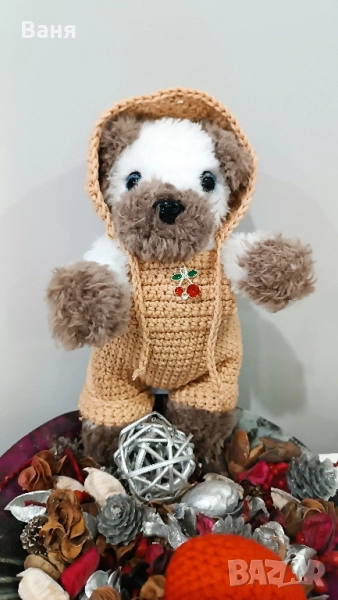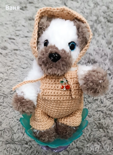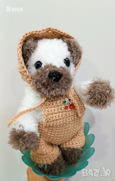 Меко плетено кученце с подвижни лапички, изработено от пухеста прежда в бяло и кафяво. Има големи блестящи очи, черно носле и облечено в бежов гащеризон с копчета. Очарователна ръчно изработена играчка, подходяща за подарък или декорация.