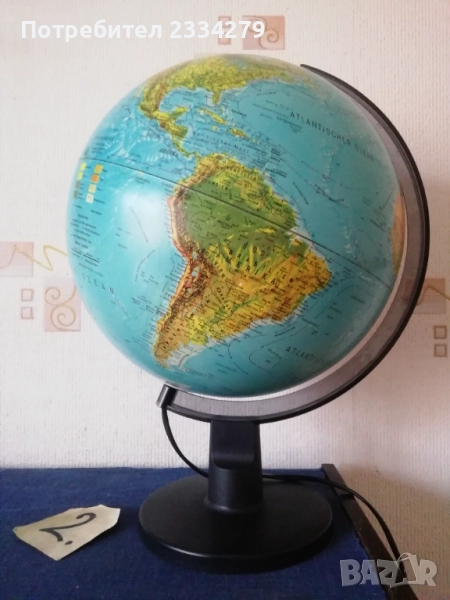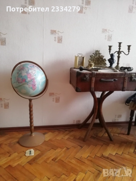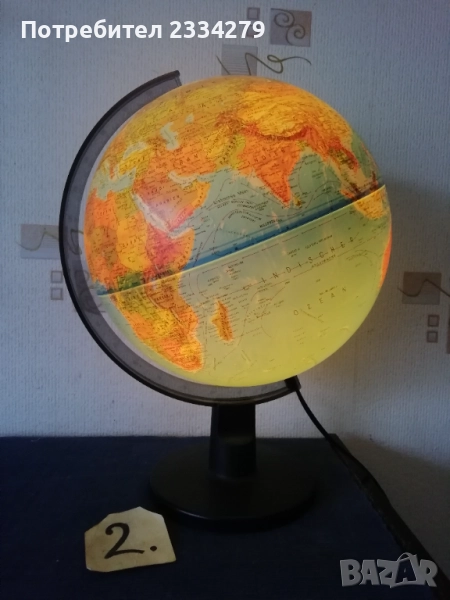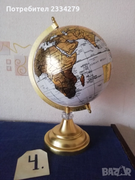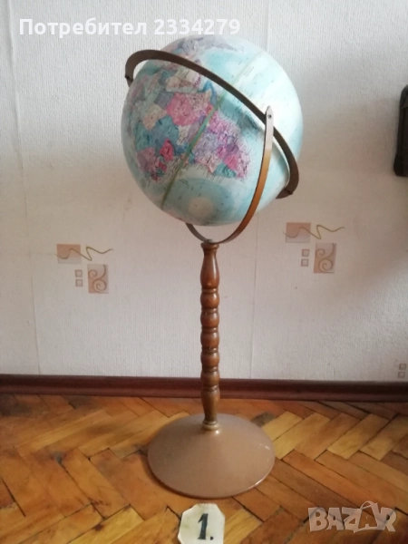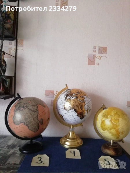глобуси от различни държави в различни години. N:1стар паркетен глобус на стойка с подвижна метална горна част, дървена орнаментирана стойка тяло, размери: височина 80см., размер на топката-глобуса 12 инча, изработка на Replogle® ,,World Nation" made in U.S.A., цена 45€.; N:2 географски светещ глобус изработен в Дания с размери 43х33см., цена 23€.; N:3 глобус изработен от метал и пластмаса с размери 28х22см., цена 13€.; N:4 глобус с размери 34х22см., цена 13лв.; N:5