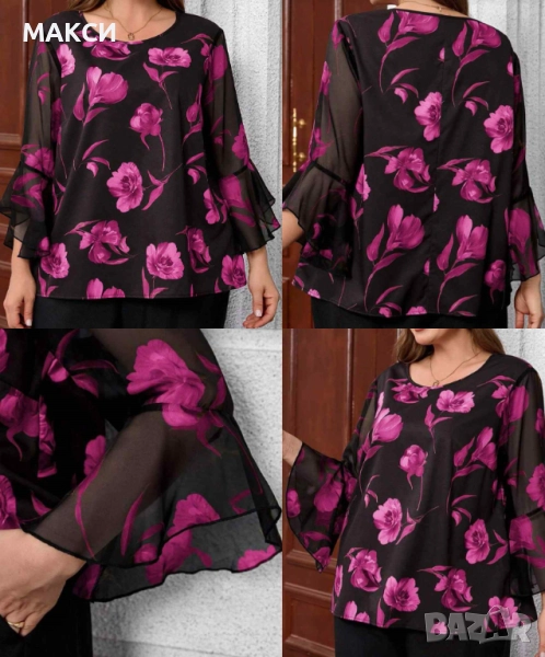 Макси елегантна ефирна блуза с ефектни ръкави в черно на красиви цветя в две разцветки → Обява 52004198